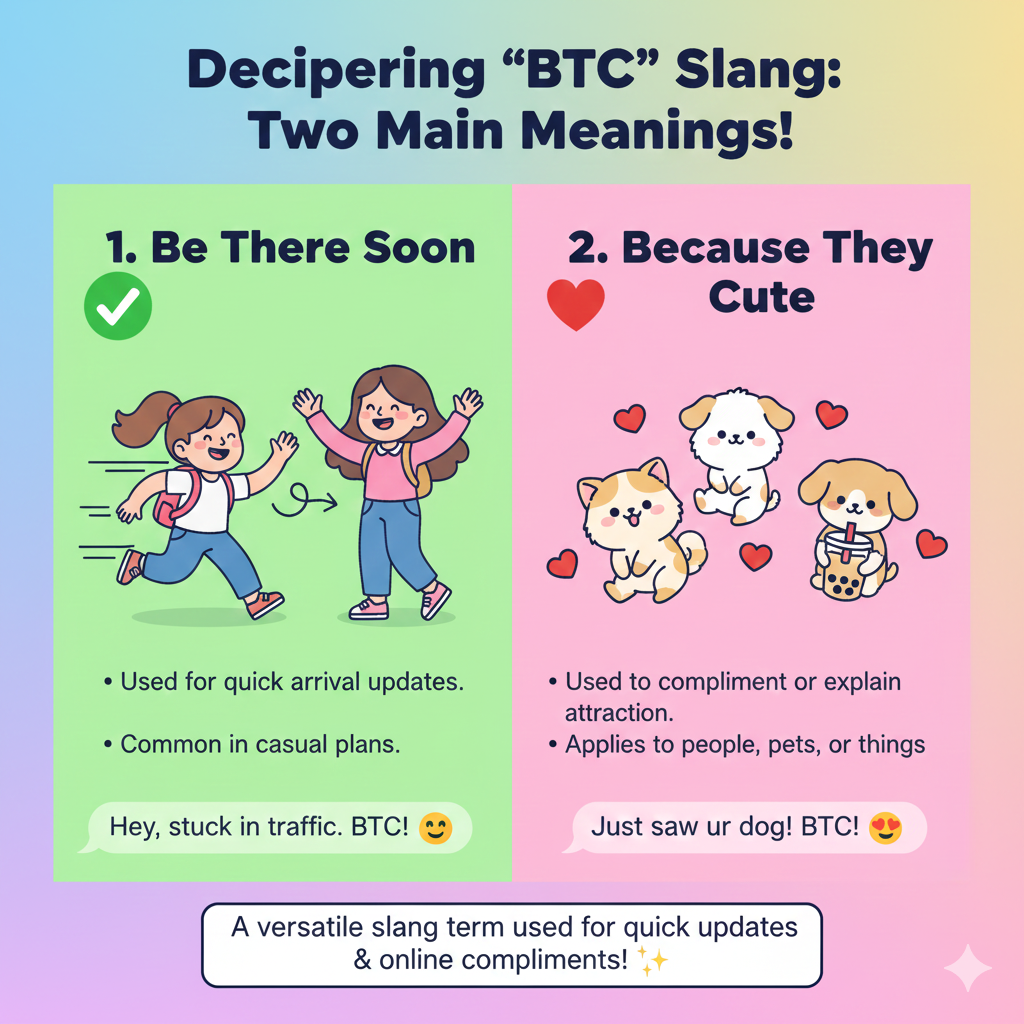 When a girl texts âBTCâ she usually means âBe There Soonââa quick, simple update used during casual conversations. In a fun or flirty tone, it can also mean âBecause They Cute,â especially in playful teasing. Though BTC can refer to Bitcoin, that meaning only applies if the conversation is already about money or crypto.