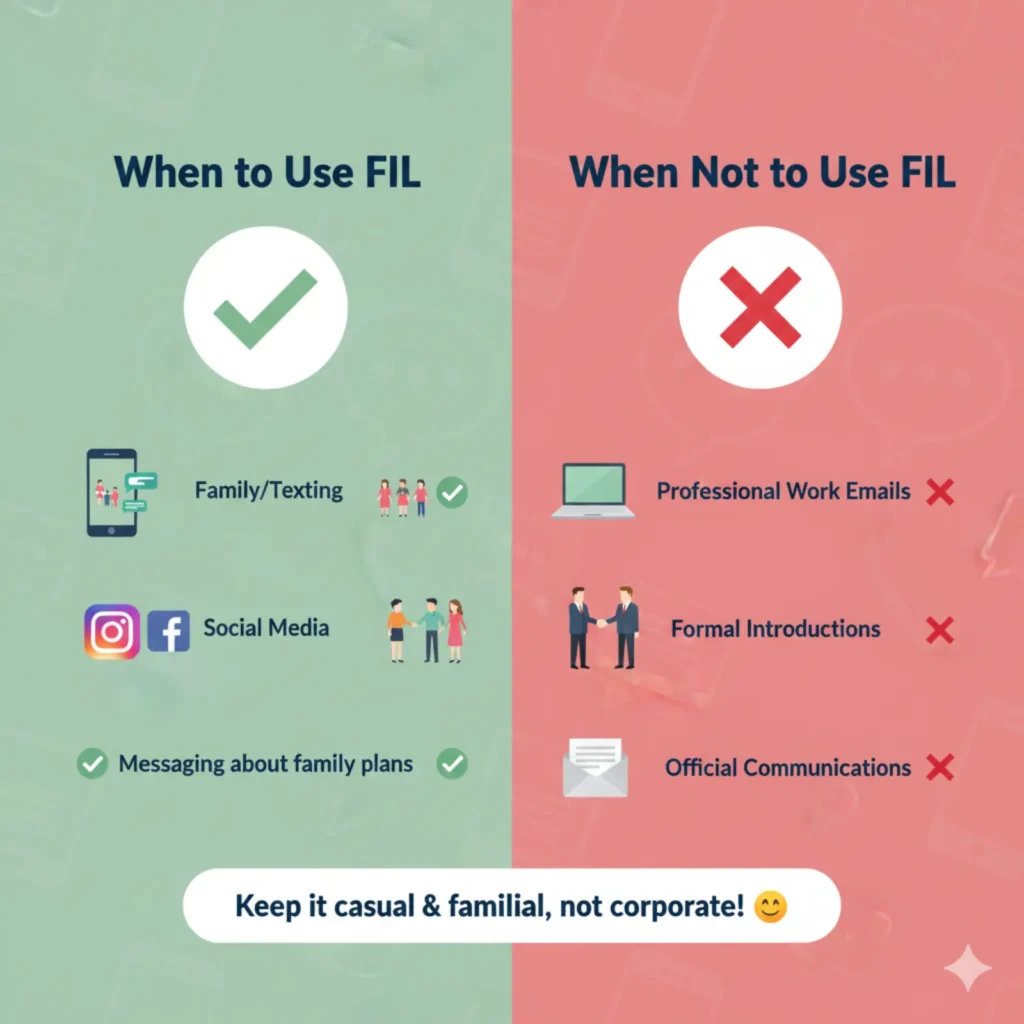 If you’re talking to someone older or in a professional setting, it’s safer to say “father-in-law” instead of FIL to avoid confusion.