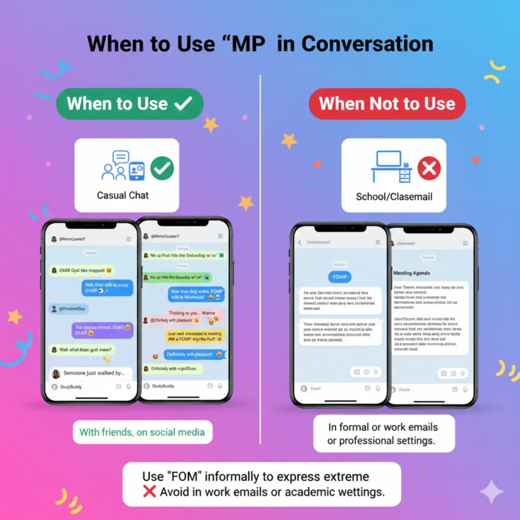 Hereâs how FOMP meaning in text plays out in real chats. These examples show different tonesâfunny, friendly, slightly flirty, and shocked.