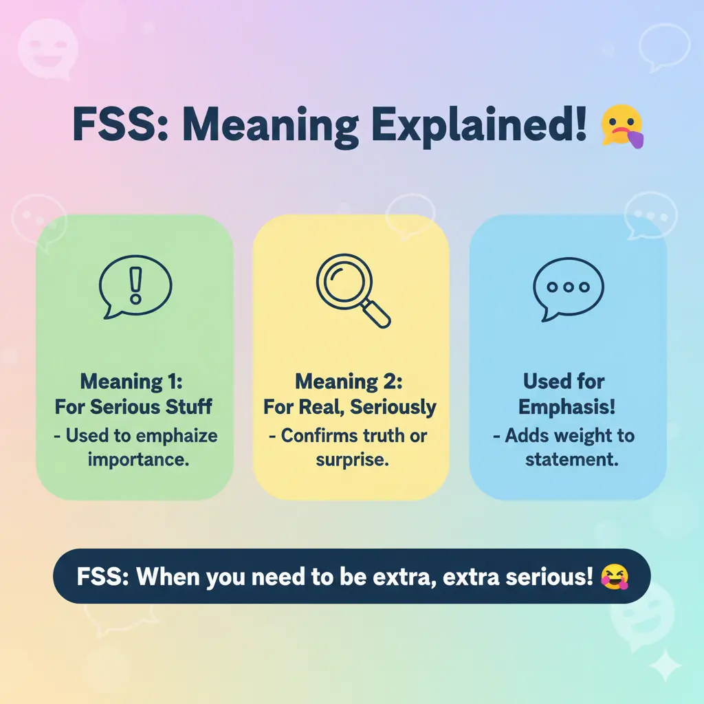 In short, FSS is a casual slang term used to emphasize seriousness, agreement, or surprise in conversations. It’s perfect for friends, DMs, or social media, but not for formal settings. Next time you see FSS in a message, you’ll know it’s the sender’s way of saying, “No joke, I mean this seriously.” Just remember—context is everything. Drop it in chats confidently, and you’ll fit right into the casual online lingo.