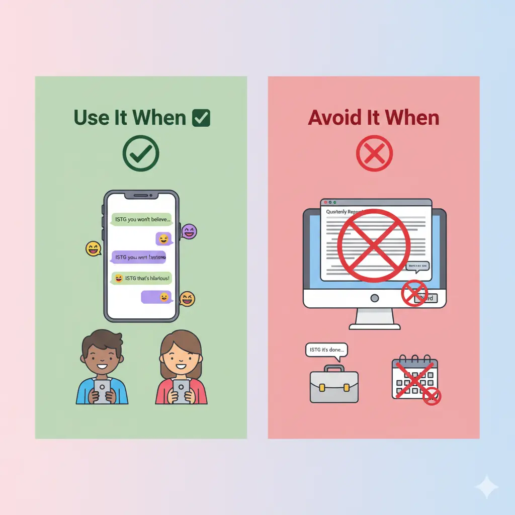 Who uses it? Mostly teens and young adults — basically the crowd comfortable with internet slang and abbreviations. It’s less common in formal writing, professional emails, or in older age-groups that prefer full phrases. As one guide says: “ISTG is one of the most common new acronyms used by teens.” Your Teen Magazine