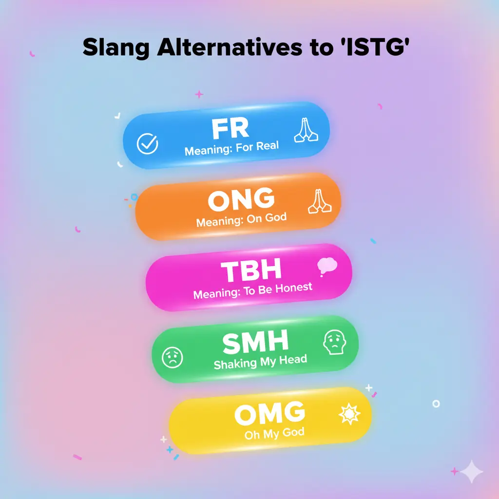 Here are some related slang acronyms or phrases you might see alongside “ISTG”: