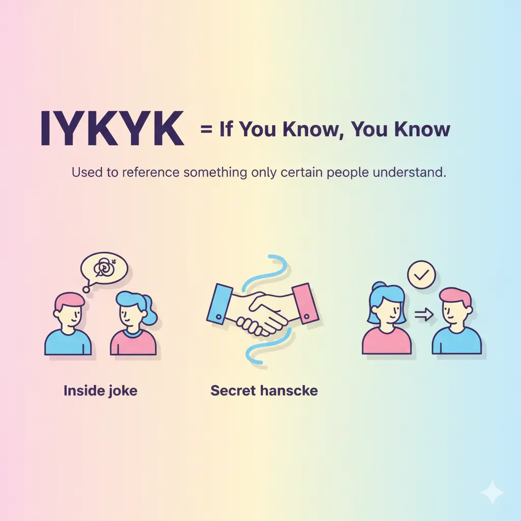 The term “IYKYK” stands for “if you know, you know.” Dictionary.com+2Keyhole+2 It’s an abbreviation used to hint at something that only a certain group of people will understand—often referencing an inside joke, shared experience, or cultural reference. Cambridge Dictionary+1