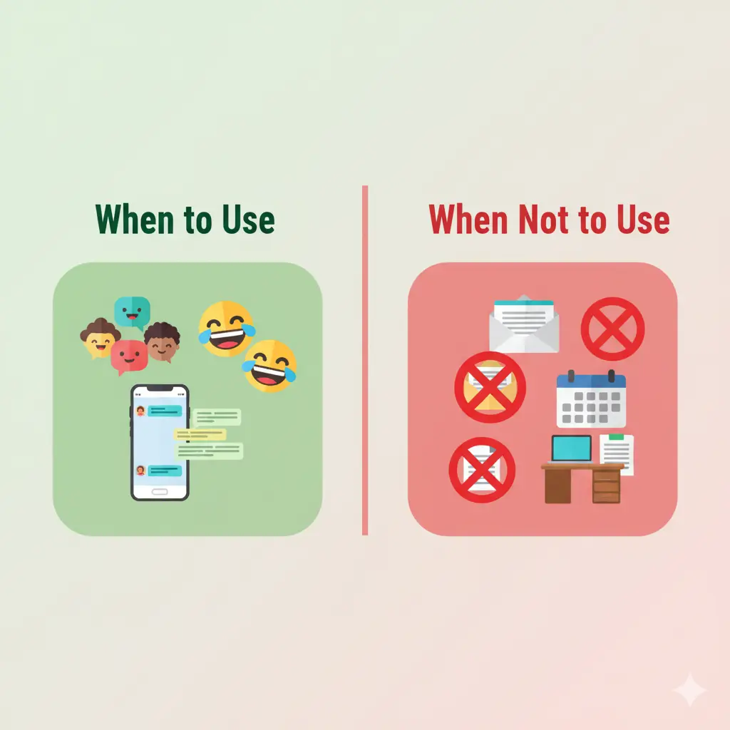 - In formal or professional communications: e.g., emails with your boss or business partners. The inside-joke tone may seem awkward or exclude others.