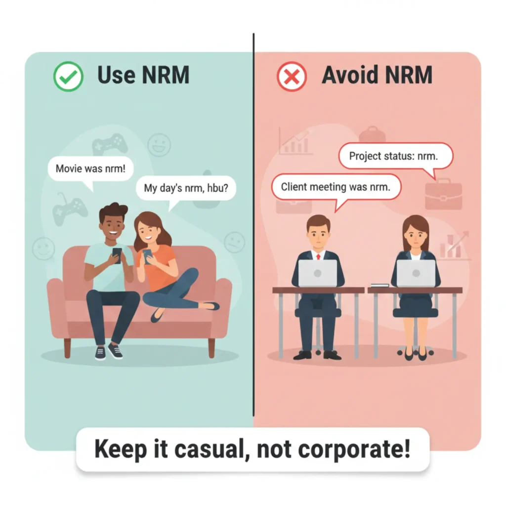 For example, replying “NRM” to a boss asking about a project update might sound careless or unclear. In those cases, full words are always safer.
