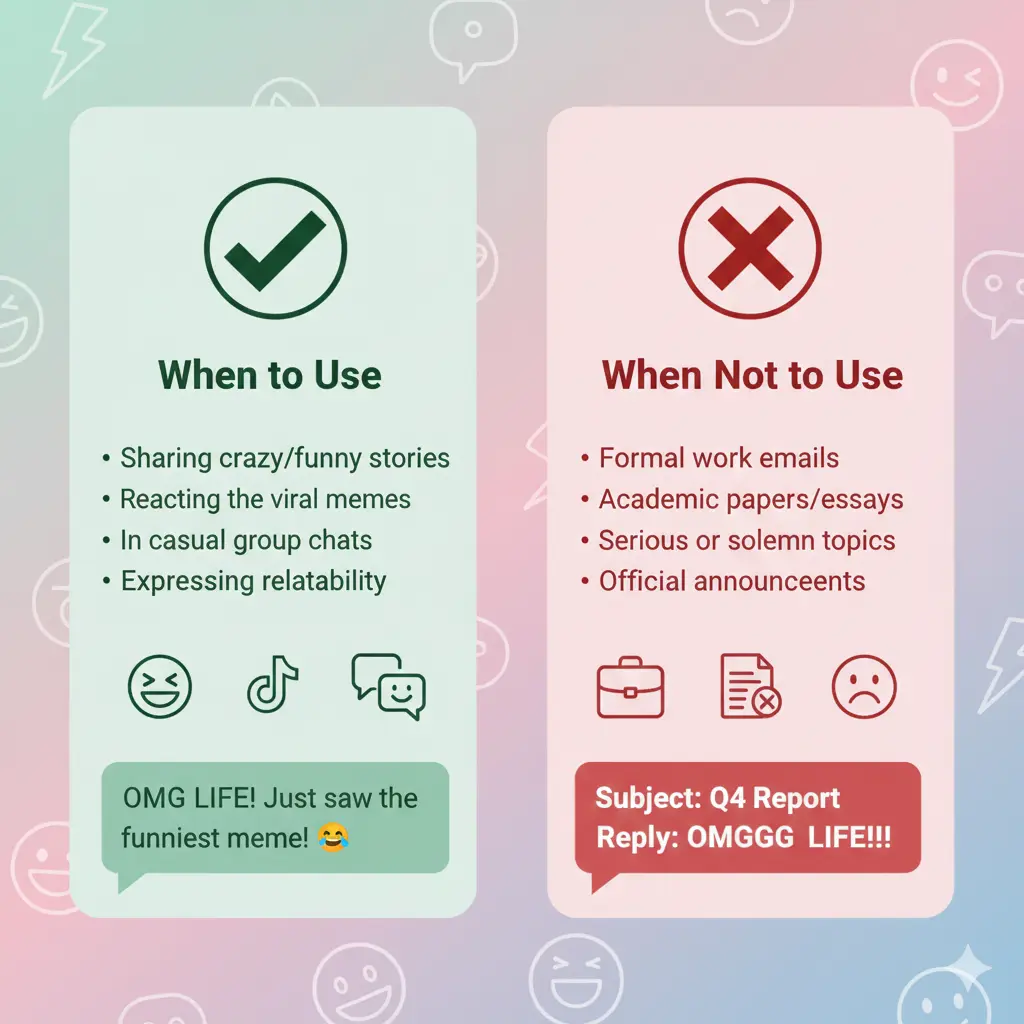 Use it freely in casual chats, memes, and social media — just avoid it in formal settings.
