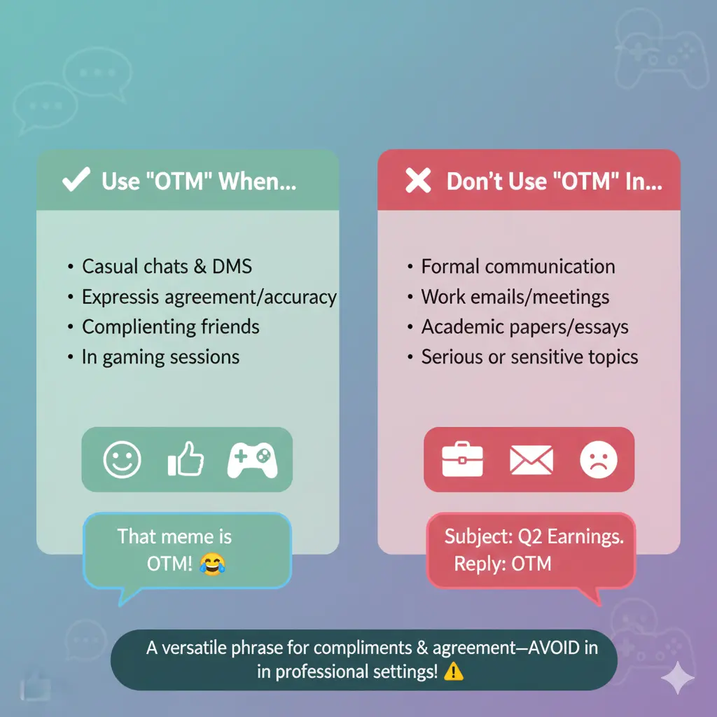 OTM is casual and belongs in friendly or social settingsânot work or school conversations.