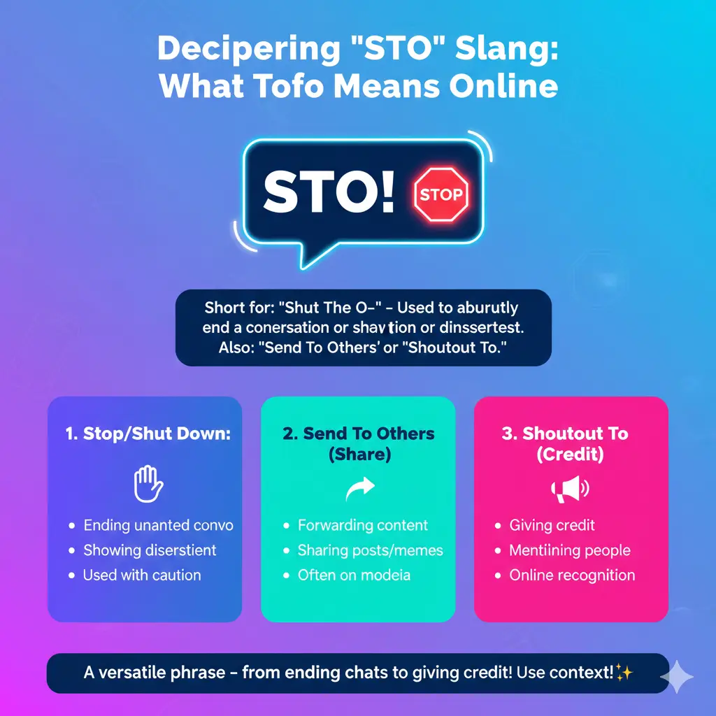 “STO” is a short, trendy, and very casual abbreviation that mostly means “stop” but can also mean “send to others” or “shoutout to,” depending on the context. It’s widely used across texting, TikTok, Snapchat, and Instagram — especially by younger users who love fast, expressive slang.
