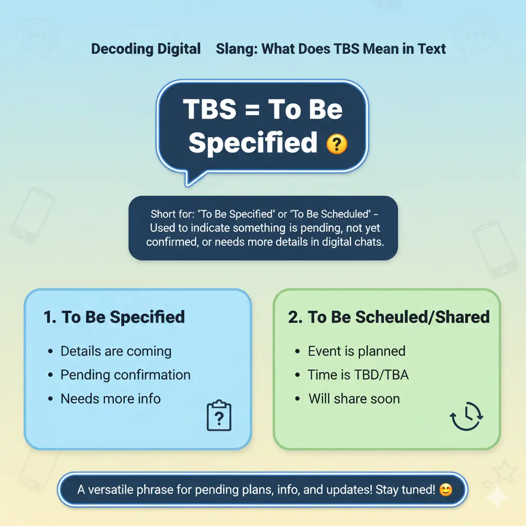 To sum it up, TBS stands for “To Be Specified” or “To Be Shared,” and it’s used when details aren’t ready yet. It’s quick, casual, and perfect for everyday texting. Whether you’re planning a hangout, teasing something exciting, or just don’t have all the information, TBS keeps the conversation moving smoothly.