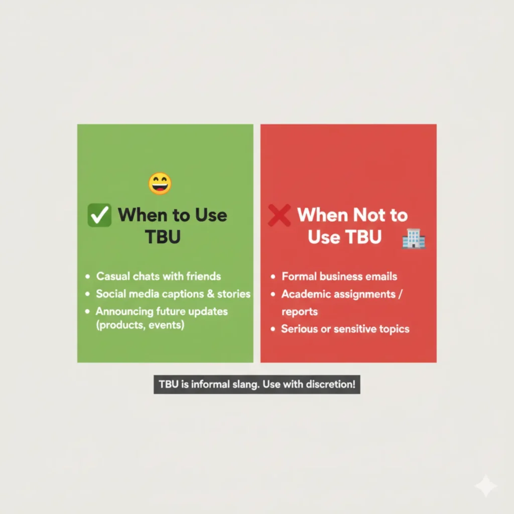 - Formal emails, work reports, or professional correspondence. Using TBU in these contexts can seem lazy or unprofessional.