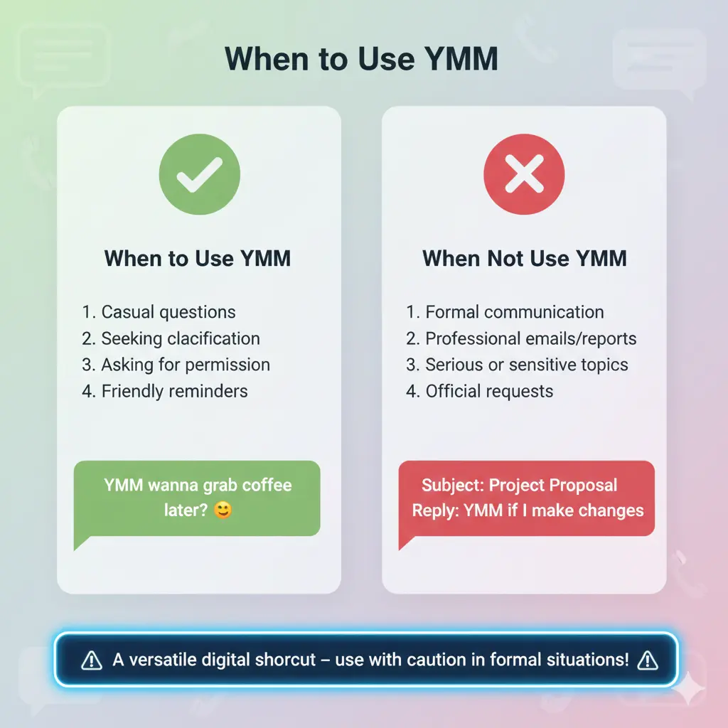 Because YMM is very casual, using it in formal settings may seem unprofessional or unclear.